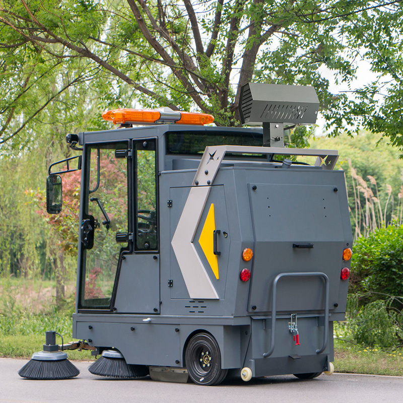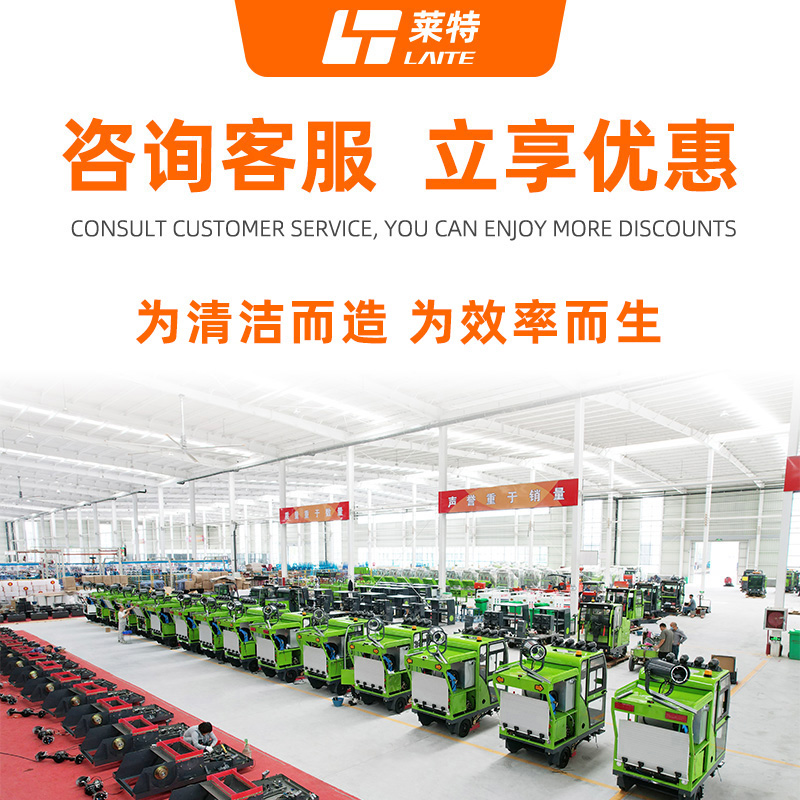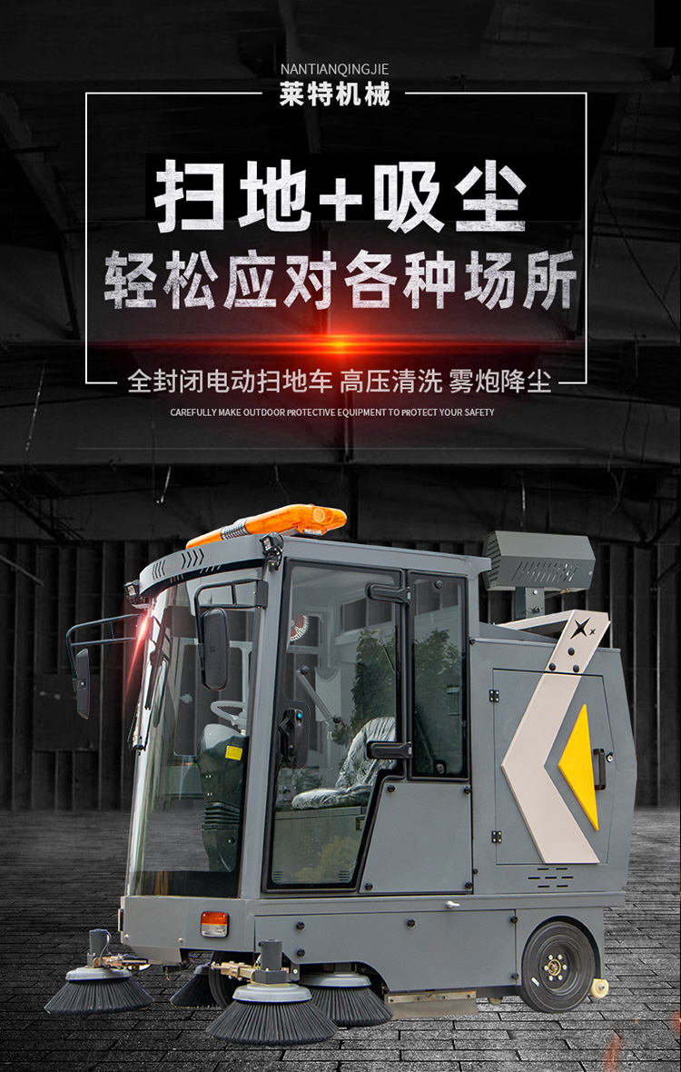 萊特LT-G22型全封閉駕駛式掃地車,配備高壓清洗和高壓霧炮功能,清掃寬度2200mm,滿電工作時間為6-8小時,工作效率:16500㎡/h,采用的是6塊150A的鉛酸免維護電池。高壓霧炮射程可達10米以上,可對作業環境高效的降塵,還可以用于綠植養護和環境消殺。高壓水槍可以對地面頑固污漬進行清潔,還可以沖洗路牙石,為綠植澆水,工作之余,還可以用高壓水槍清洗車輛。應用場景為:廠區、車間、公園、街道、物業小區、碼頭、學校、機場等需要大面積清掃的區域區域。